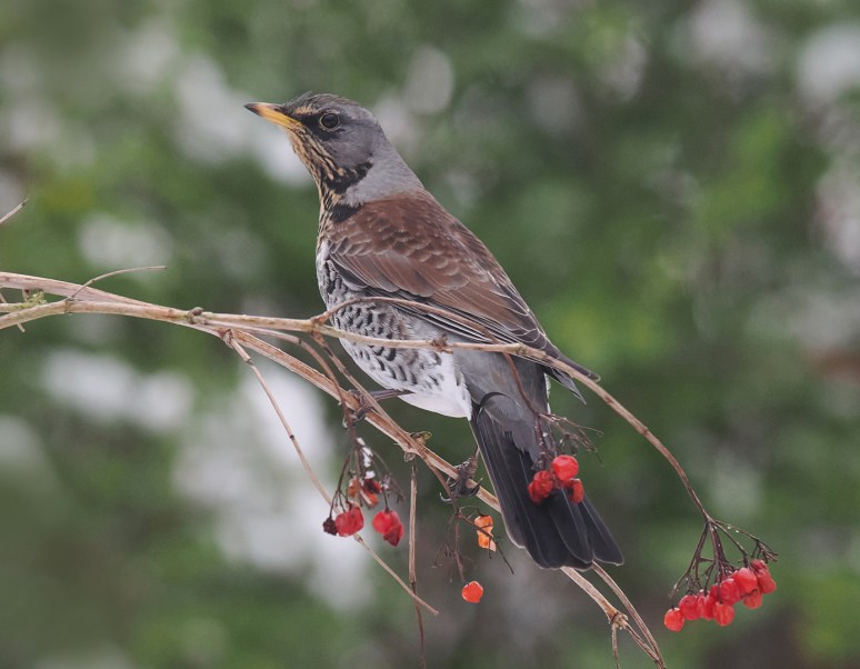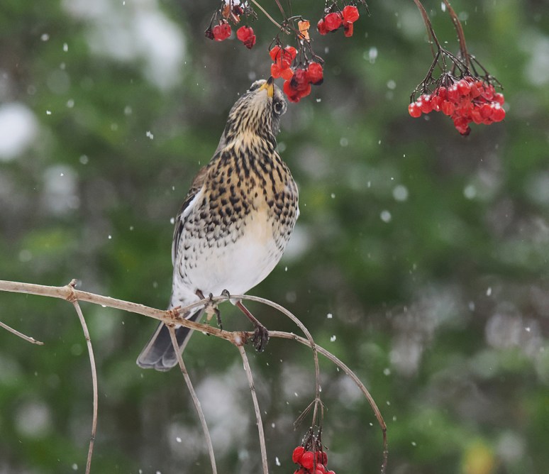 Eén soort waar ik dan altijd naar uitkijk is de Kramsvogel. Zodra de voorraad meidoornbessen in het open landschap compleet is verorberd en de grond bevroren raakt en met sneeuw bedekt zoeken ze graag de alternatieven op en die vind je in mijn tuin in de vorm van de besjes van de Gelderse Roos.