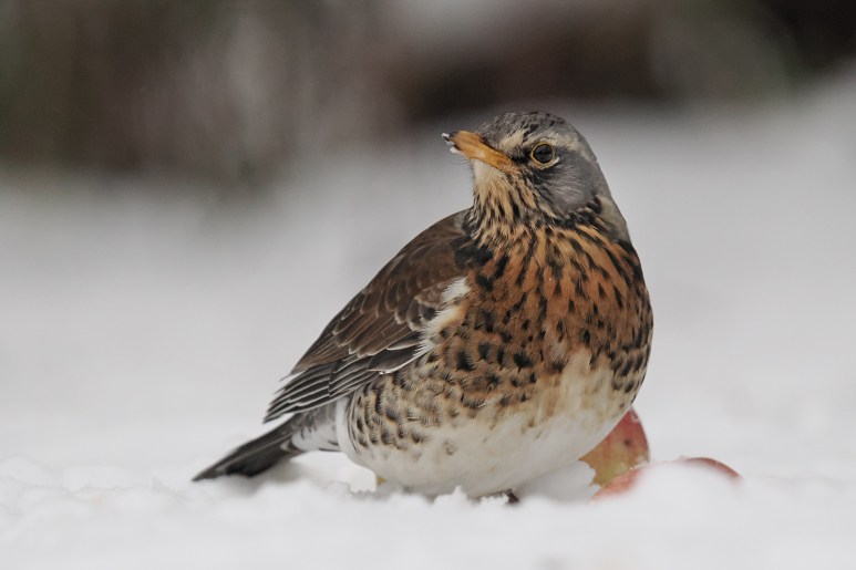 Naast bessen foerageren ze ook graag op de appels die in de tuin heb gegooid. Ook daar wil ik nog graag een opname van maken maar dan moet ik eigenlijk languit in de sneeuw gaan liggen om ‘m een beetje leuk te laten afsteken tegen de achtergrond. Daar pás ik dan weer voor en als alternatief ga ik héél laag op de hurken doodstil een poosje zitten wachten tot ie komt. Als dat moment daar is schiet de kramp mij spontaan in de kuiten. Oei, dat doe zeer, máár een paar foto’s lukken nog net!