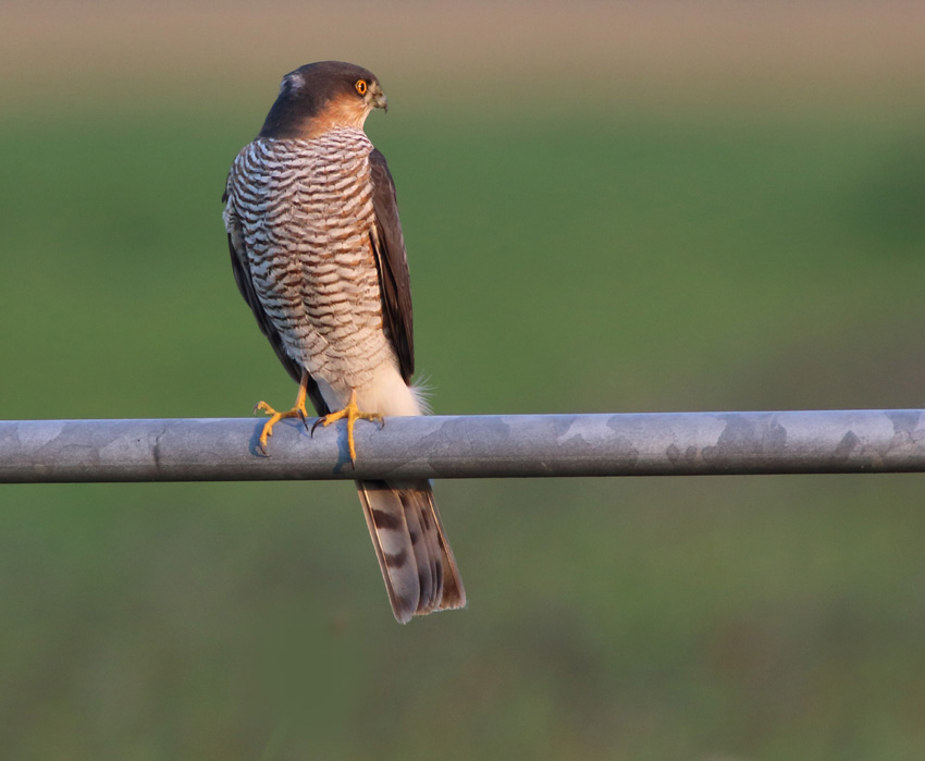 Ik zie opeens een prachtige sperwer tussen de spijlen van een metalen landhek zitten. Als ik de auto voorzichtig heb gekeerd en het raampje opendraai is de vrees dat de vogel gevlogen zal zijn deze eens keer niet gegrond.