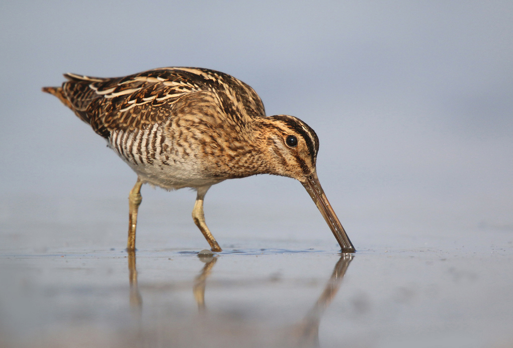 In dit geval is dat een watersnip die alsmaar priemend in het laagje water, daar zó mee in beslag is genomen dat ie steeds dichterbij komt ..En dan is het zover en ratelt de camera enkele keren ..