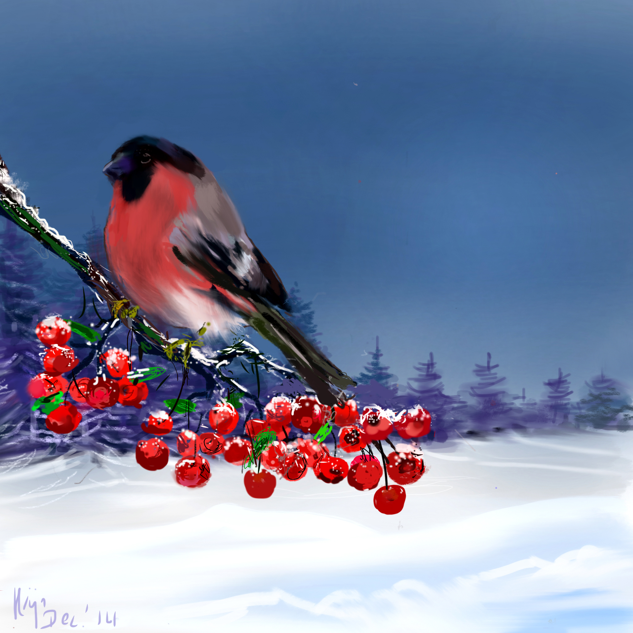 Voor alle lezers van ‘Krijnsels’ heb ik een speciaal wintersfeer-tekening-groet gemaakt. Digitaal geschilderd op de I-pad. Ik houd van het ’t zalmrose op de buik van een goudvink én van wit-bepoeierde bessen en helemáál als dat scherp staat afgetekend tegen een heerlijk besneeuwde achtergrond.