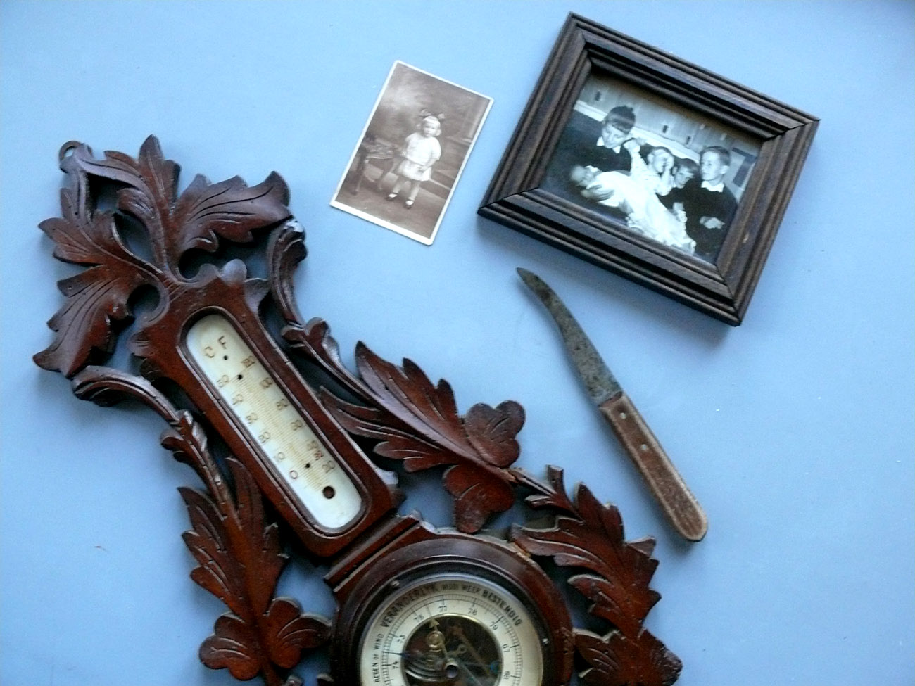 Een oeroude, aan elkaar gelijmde en door houtworm geperforeerde barometer, waarvan mijn pa de gelukkige eigenaar werd op een ‘boeldag’ in het dorp. Ik zie ‘m er nog glunder mee ons huis binnen stappen.