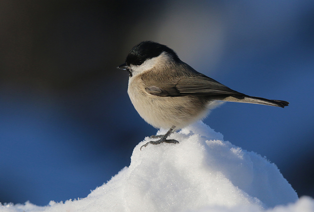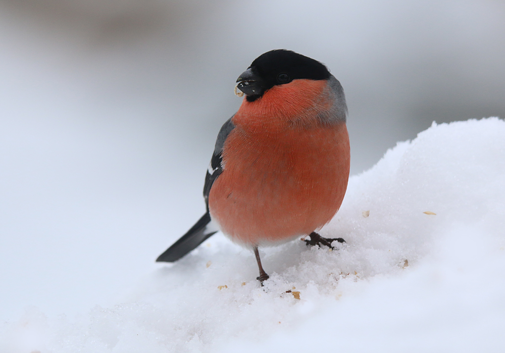 Zo’n goudvinkman komt met zijn zalmkleurige verenpak juist prachtig uit tegen de felwit besneeuwde achtergrond.