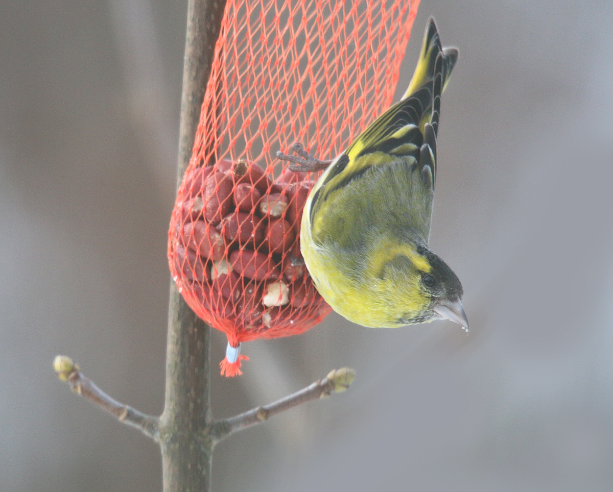 Op de laatste ochtend voor ons vertrek hangt er een Sijs ( man) aan de pinda’s.