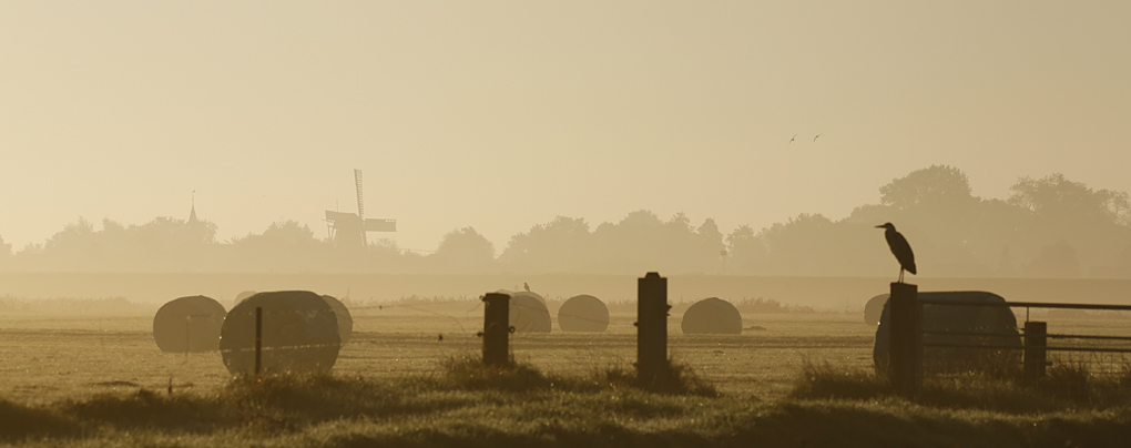 Hoewel ik niet zo’n liefhebber ben van die in plastic ingepakte ronde strobalen, vind ik die moderne variant van de ouderwetse hooi-oppers wel een leuke tegenhanger vormen van het oude ; de kerktoren, de molen en het landhek.