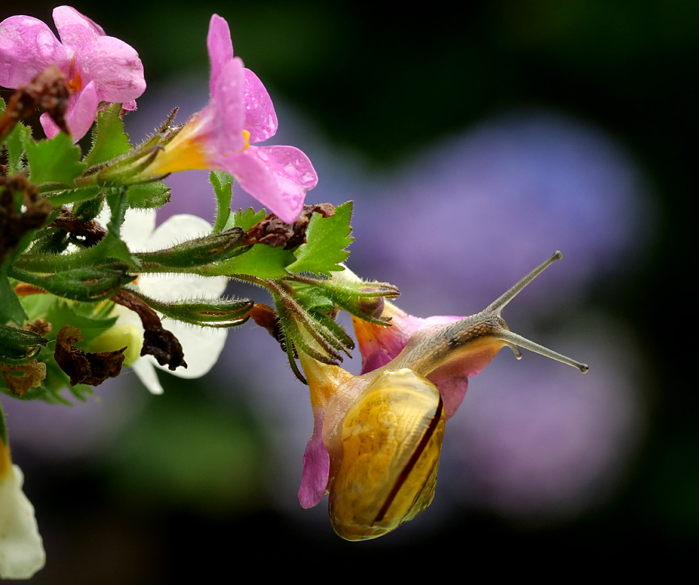 In het natte, nadruppelende bloem- en struikgewas ontdek ik vrij snel een paar kleine, actieve exemplaren dat naar hun aard de tijd neemt om ‘easy-going’ hun slijmerige sporen te trekken.