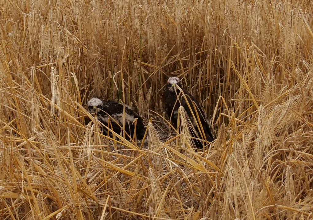 Tijdens het combinen was er een nest Bruine Kiekendieven op zijn graanakker ontdekt en men had daarvoor keurig een klein stukje tarwe laten staan, zodat het nest met de al vrij grote jongen gespaard konden blijven.