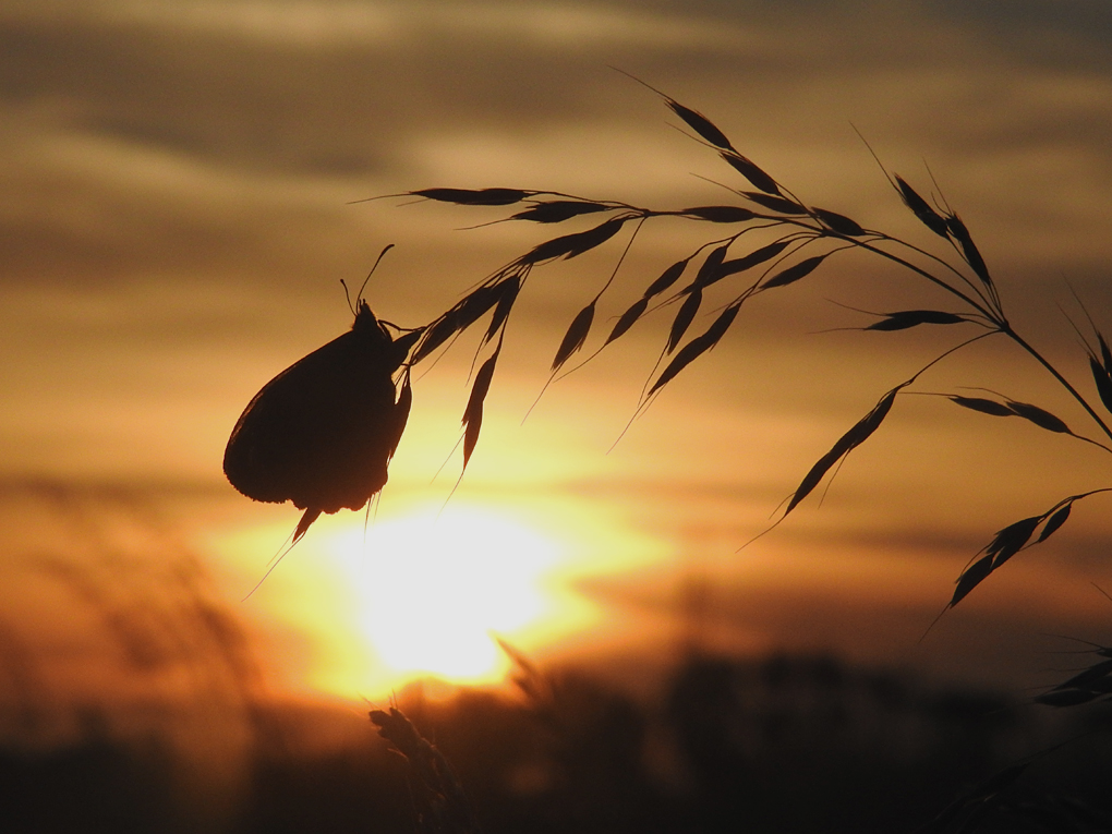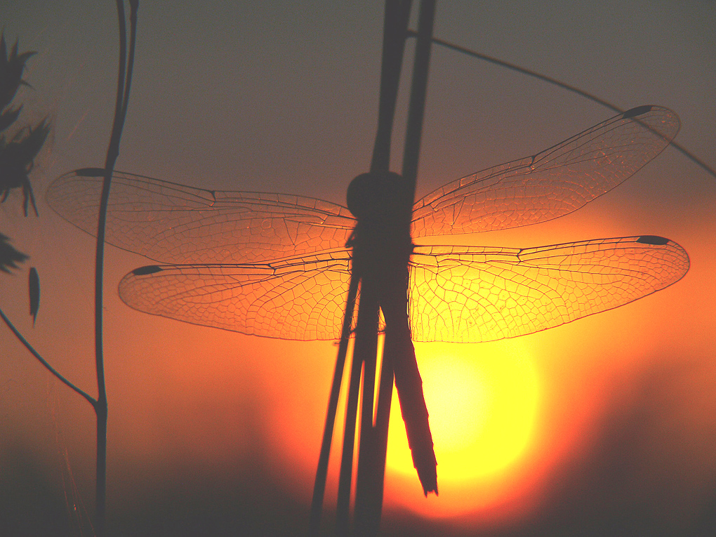 Hieronder toon ik ook nog even twee voorbeelden van eerder gemaakte soortgelijke insecten-opnamen in drogere lucht, waarbij er hier geen sprake is van een bloedrode ondergang, maar waar op het moment van het verdwijnen van de zon de vlinder of libelle héél kort in één vlammende samenballing, scherp wordt afgetekend tegen de snel verdonkerende hemel.