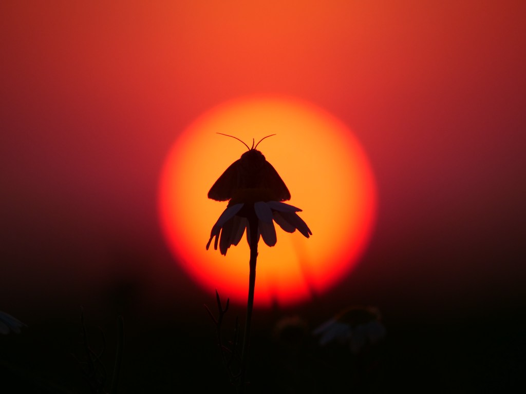 Graag mag ik in zo’n situatie tegen het vallen van de avond met de camera langs de slootberm scharrelen om te proberen een op een hoge halm rustend insect te vinden en die dan op de foto als een silhouet te laten afsteken tegen de dalende zon. Gisteravond nam ik ook weer eens die gelegenheid te baat, doordat ik tijdig een kleine motvlinder op een kamille-bloem zag zitten en daar meteen een goede foto-kans in zag.