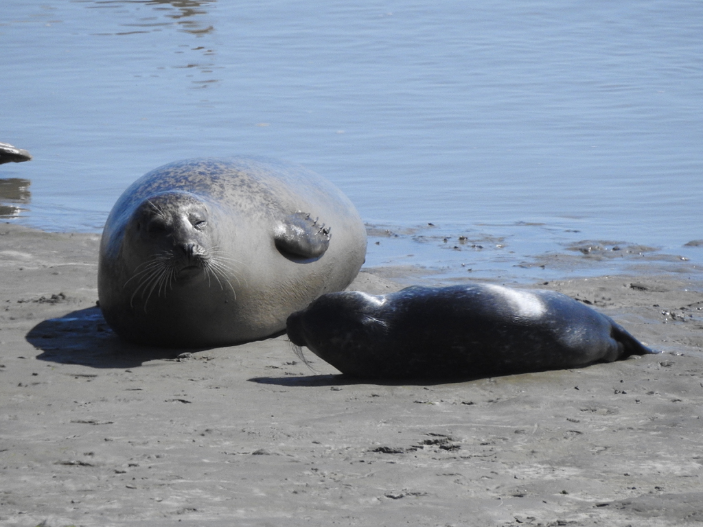 Omdat op de dijk vlakbij, een door het Groninger Landschap aangebracht kijkscherm is geplaatst waarachter je een blik kunt werpen op een rustende groep zeehonden, besluit ik om een korte tussen-uitstap te maken om daar ook even mijn foto-geluk uit te proberen en gelukkig is er een flink stel van deze prachtige wezens aanwezig, waarvan de meeste voornamelijk als hobbezakken in het slib liggen. Hoewel ik vanuit fotografisch perspectief er graag dichterbij was gekomen om ze wat anders te benaderen, is dat uiteraard niet toegestaan en doe ik het maar met een ‘point en shoot’ –actie van bovenaf..