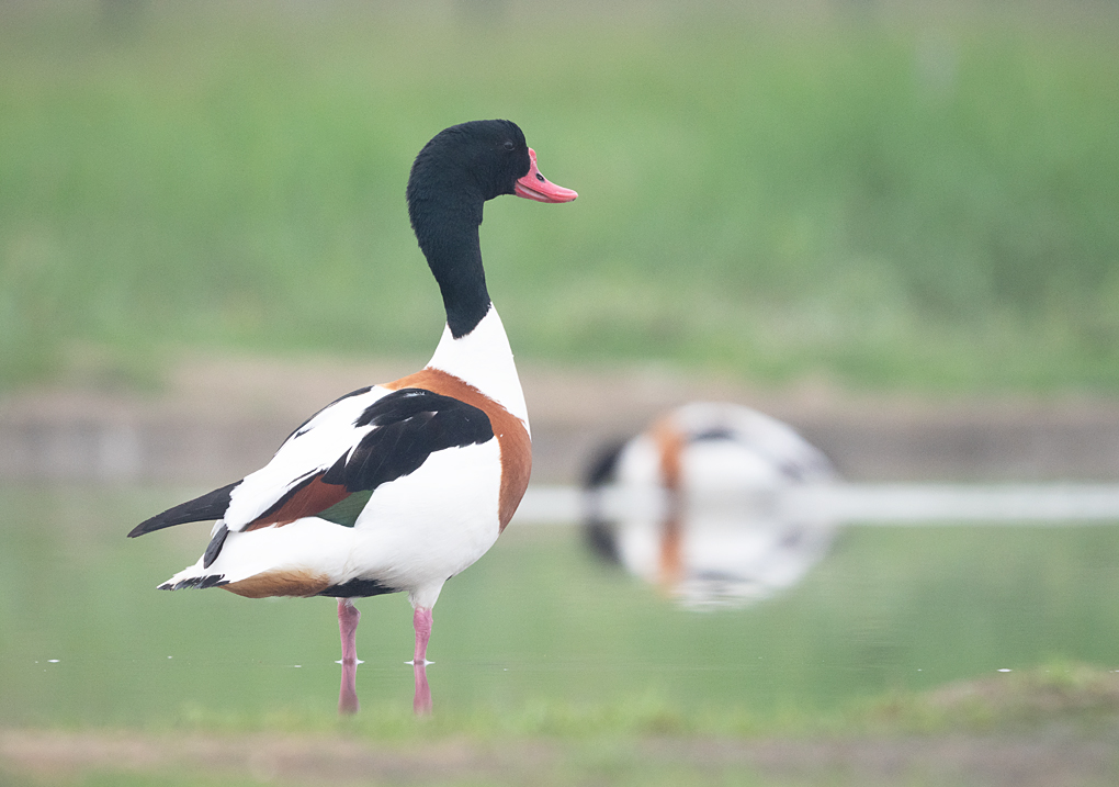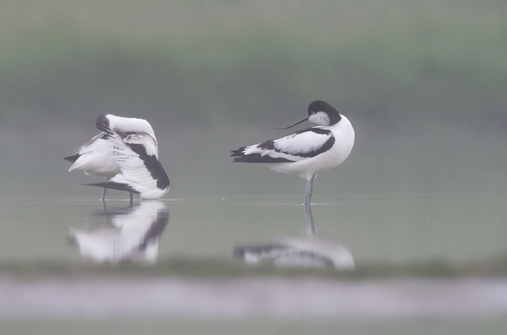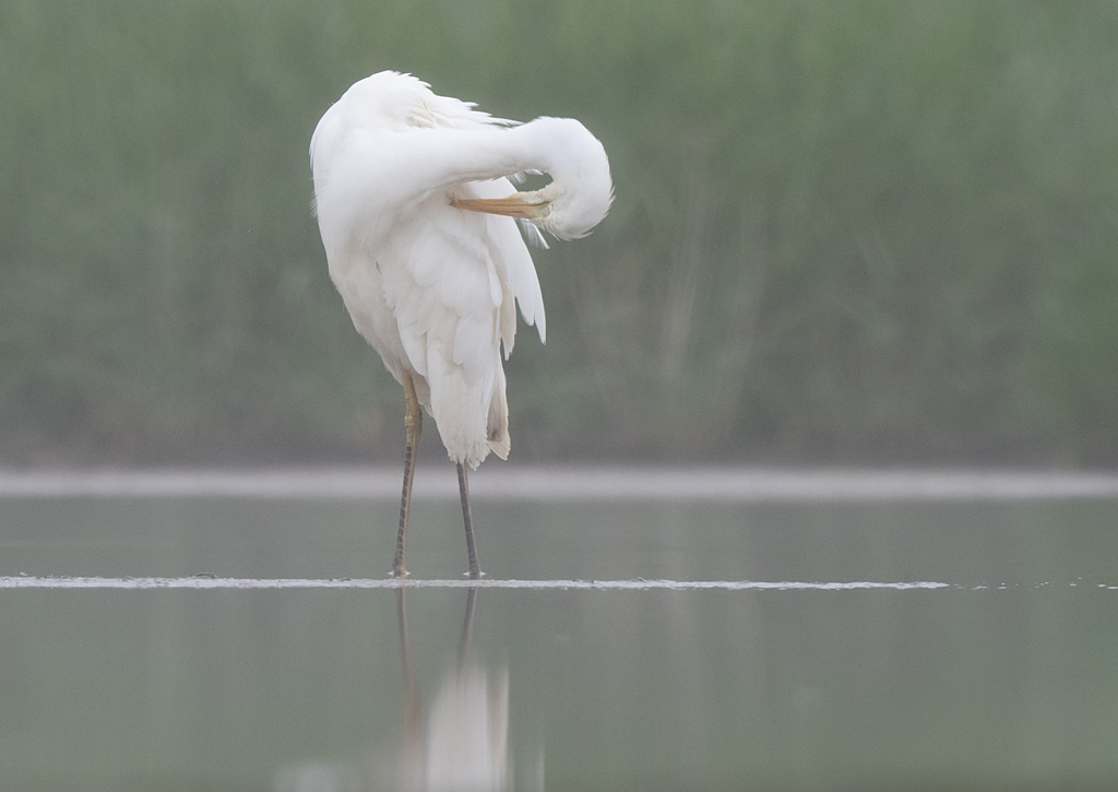Op vrij grote afstand staan een Grote Zilverreiger en wat Bergeenden en Kluten zich in het spiegelende water te poetsen en met het diffuse licht levert dat dan toch nog wel een aardig plaatje op.
