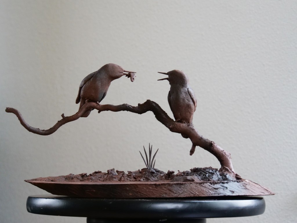 Tot slot nog even een Valentijn-achtige foto van een van mijn onlangs geboetseerde beeldjes namelijk die van een IJsvogelman die zijn vrouw op sierlijke wijze het hof maakt met een vers gevangen visje.