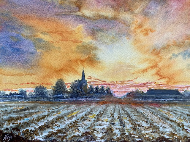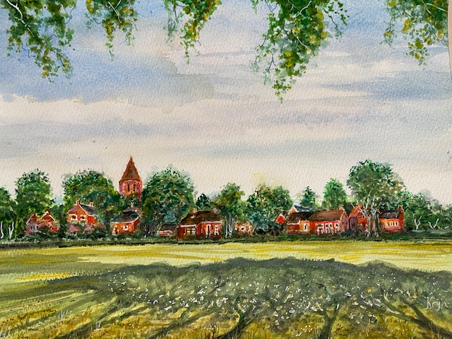 Maar ik had mijn zinnen er nu eenmaal op gezet en het was de bedoeling om na enkele oefen-opzetjes toch te starten met het maken van landschapsportretten van dat weidse Groninger landschap en bijpassende verre dorpsgezichten waar ik altijd zo van smul.  Ik wilde hierbij een paar werkjes maken waarin ieder schilderij een heel eigen sfeer uitademt en dat in weer een totaal andere entourage.
