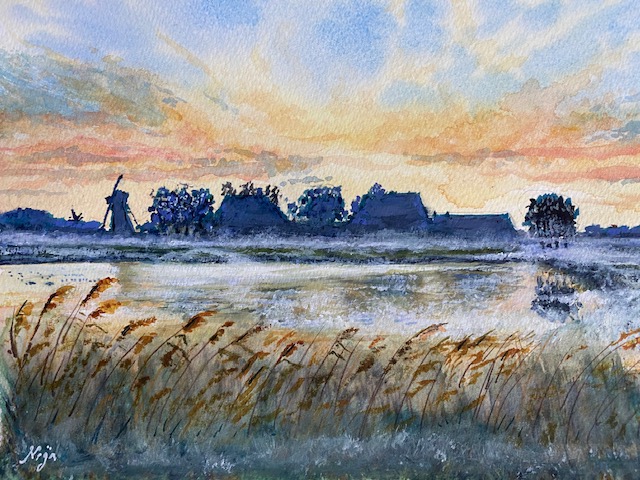 Aquarelleren vraagt een volkomen andere aanpak, omdat je hierbij – precies andersom – van licht naar donker moet werken en transparantie in pastelkleuren de basis vormen en de eerlijkheid gebied me te zeggen dat me dat nog niet meevalt.