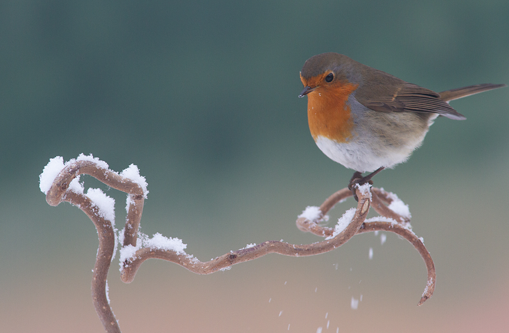 Ik heb de opstelling helemaal klaar staan wanneer het vlokwerk zijn attractief versierwerk heeft verricht en dan is het alleen nog maar wachten op de komst van een hongerige mees of roodborst. Maar dát is dan weer gek! Terwijl je zou verwachten dat na de koude ochtendstart en ’n fikse sneeuwbui de vogels zich in grote getale hongerig op het aangeboden voer zullen storten, is er op dat moment geen beest te bekennen. Het duurt maar en het duurt maar..en omdat de temperatuur al weer rap stijgt verandert het aanvankelijk nog lieftallige reepje poedersneeuw langzaam maar zeker in een druipend drablaagje..
