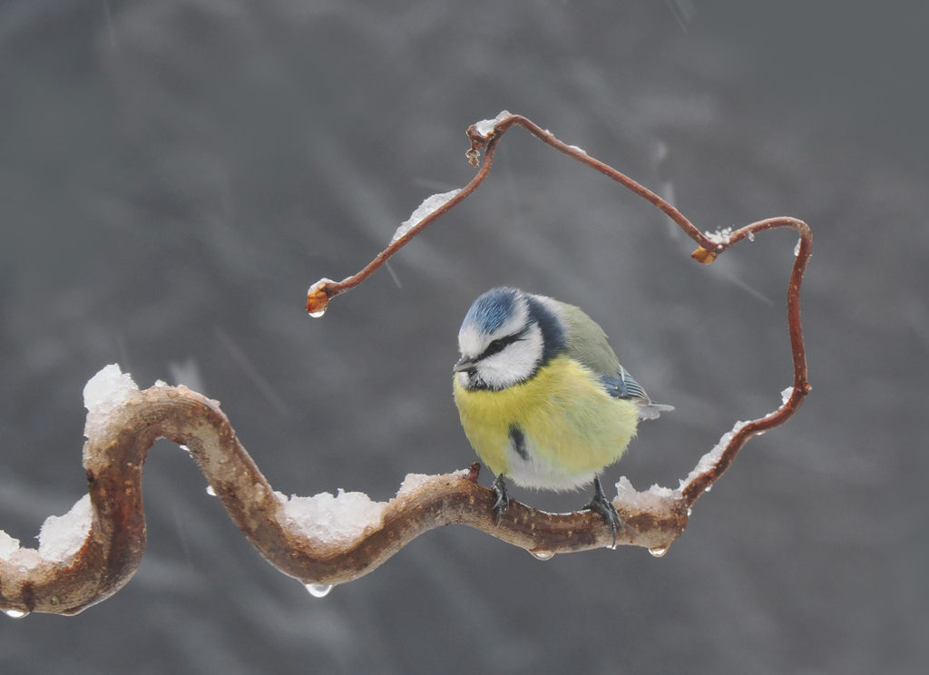 Het zijn slechts een of twee centimetertjes die het zeer tijdelijk wit maken en ik moet er als de kippen bij te zijn om het fotografisch enigszins uit te buiten. Want zo’n tuinvogelfoto wordt vaak een stuk leuker wanneer er een decoratief laagje sneeuw op het bijbehorend zit-takje is neergedwarreld