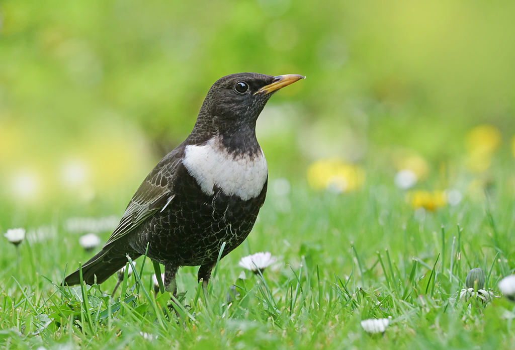 Maar ik heb geluk, want een dag later scharrelt hij af en toe opnieuw door het gras en dan zie ik de kans schoon om liggend op de ijskoude stoeptegels, vanonder een camouflage-netje deze prachtig getekende, schuwe vogel zó te portretteren als ik graag wil, namelijk vanaf een laag standpunt tussen de vage contouren van paardenbloemen en madeliefjes die mijn gazon – of wat daar voor moet doorgaan – sieren.