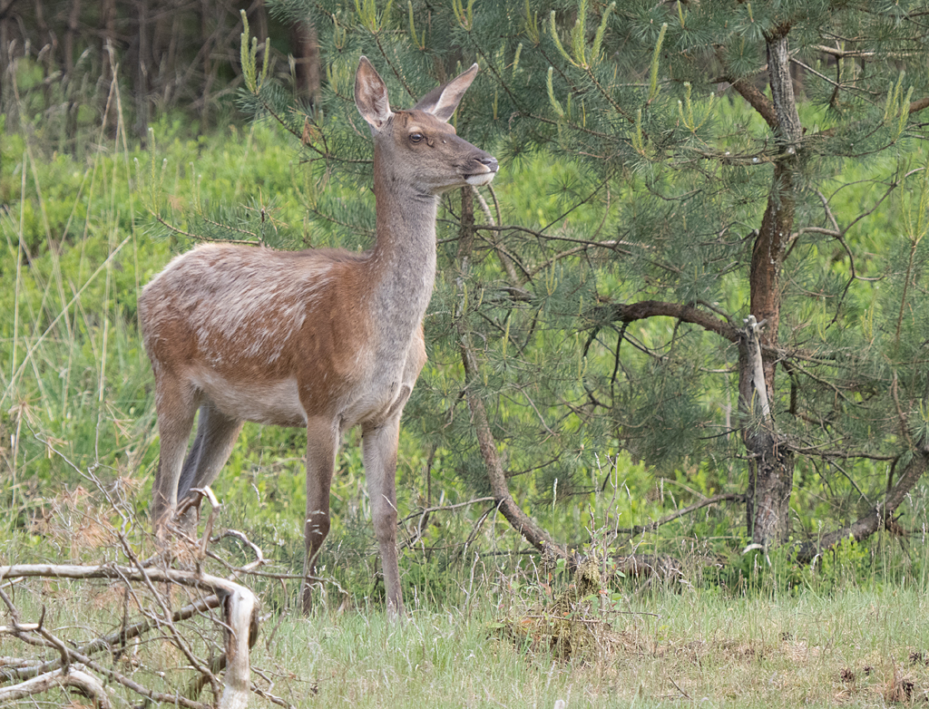 Hoewel ik eigenlijk had gehoopt om hertenmoeders met spelende kalfjes te kunnen vastleggen ben ik daarvoor kennelijk nog te vroeg in de tijd maar hinden ontdek ik wel, echter zonder dartel nageslacht.