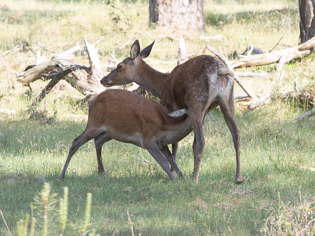 Het zijn – voor zover ik kan beoordelen – 2 of 3 jarige hinden en één kennelijk jonger dier dat voor mijn ogen een mislukte drinkpoging bij zijn moeder onderneemt die dat gedonder kennelijk niet meer aan d’r lijf wil hebben..