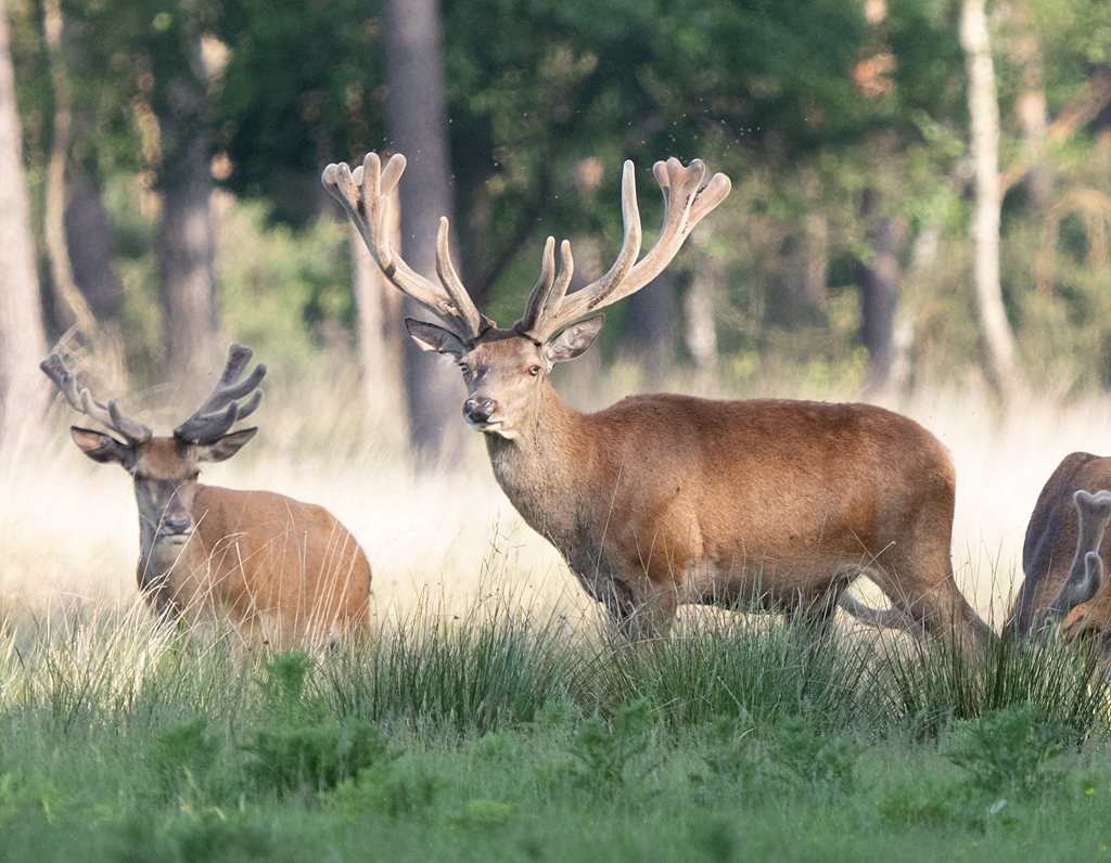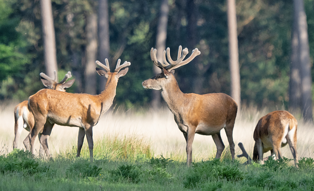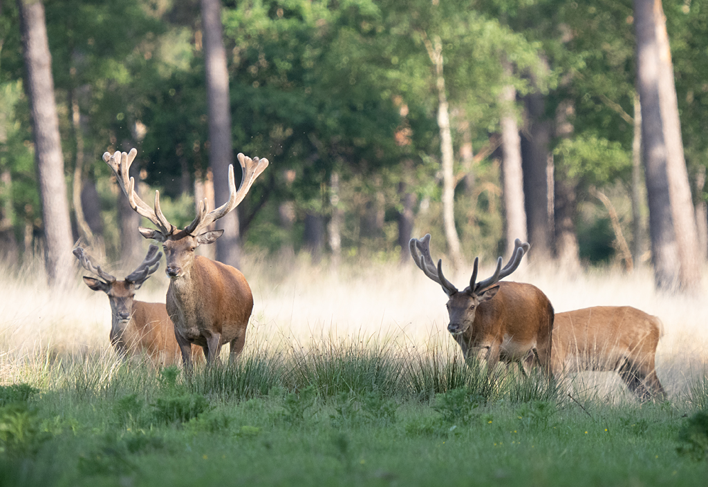 Het zijn zeven hertenmannen die hun imposante hoofden hebben gekroond met geweien van divers formaat, maar allemaal voorzien van zo’n – voor deze tijd van het jaar kenmerkende -prachtig fluwelen bastgewei. Wanneer dat gewei ( dat elk jaar wordt vernieuwd) is volgroeid, dan ontdoen de dieren zich van de afgestorven huid (dode bast) door het tegen bomen schoon te vegen.