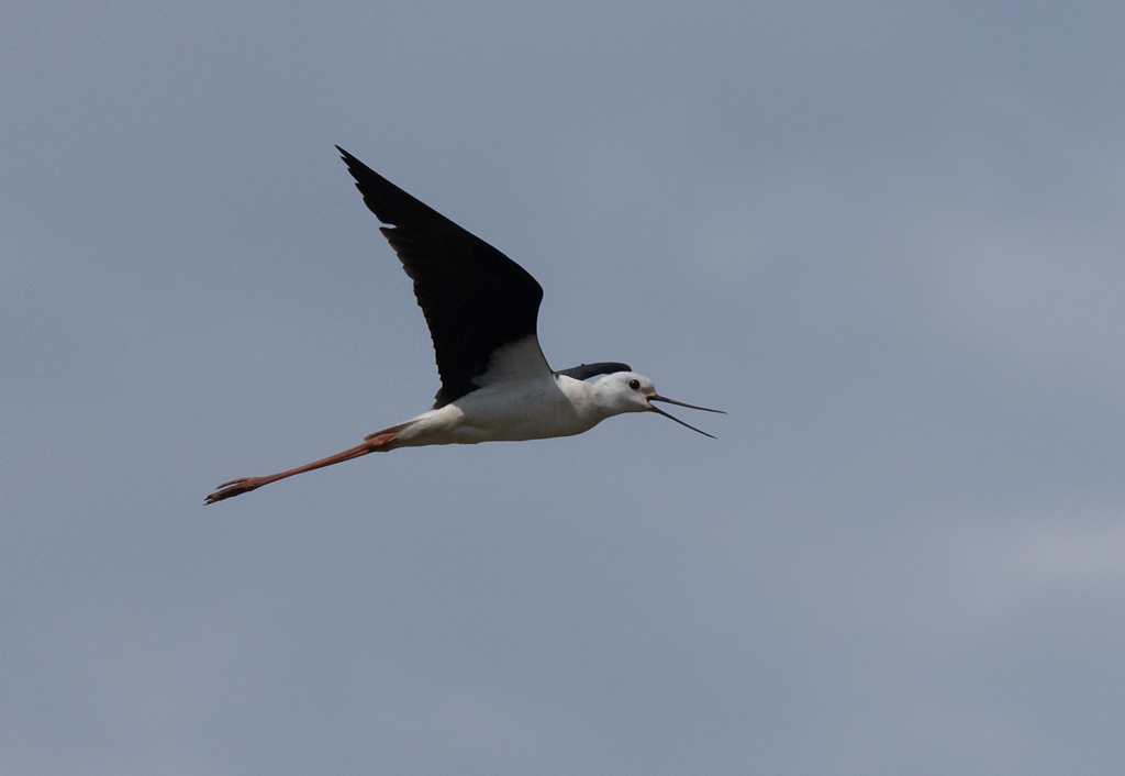 De vogel zelf lijkt er niet mee te zitten en tijdens de vlucht steekt hij die superpoten ook nog eens nadrukkelijk naar achteren uit, zodat iedereen kan zien dat zijn hele persoonlijkheid weliswaar ooit op stelten is gezet, maar dat ie er geen complex van heeft opgelopen.