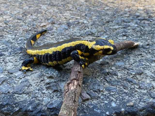 Zo wilde de Vuursalamander die ik midden op een stoffig landweggetje aantrof best even rustig poseren. Wat heb ik vaak naar dit beestje uitgekeken bij hun natuurlijke habitat zoals watervalletjes, beken en natte mospartijen maar nooit trof ik er eentje aan en nu loop ik er zomaar tegenaan.. Het kan best zijn dat de langdurige droogte dit diertje heeft verlokt om de weg over te steken in de hoop op een meer vochtige bestemming.